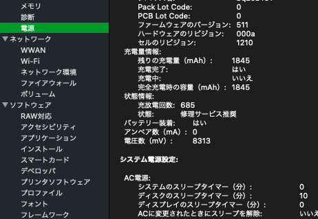 公式ヘルプによると画像中央あたりの「充放電回数」がおおよそ1000回程度が回数上限になるそうです。その視点ではそこまで切羽詰まっている印象はないですね…。しかし、問題はもう少し上の項目の「完全充電時の容量」です。公式の値は見つけることができなかったのですが、出荷時でおおよそ7000(mAh)程度になるそうです。しかし現状は1845(mAh)と、全盛期と比べて4分の1に迫る勢いです。これはどげんかせんといかんということで、おとなしく交換していきたいと思います。
