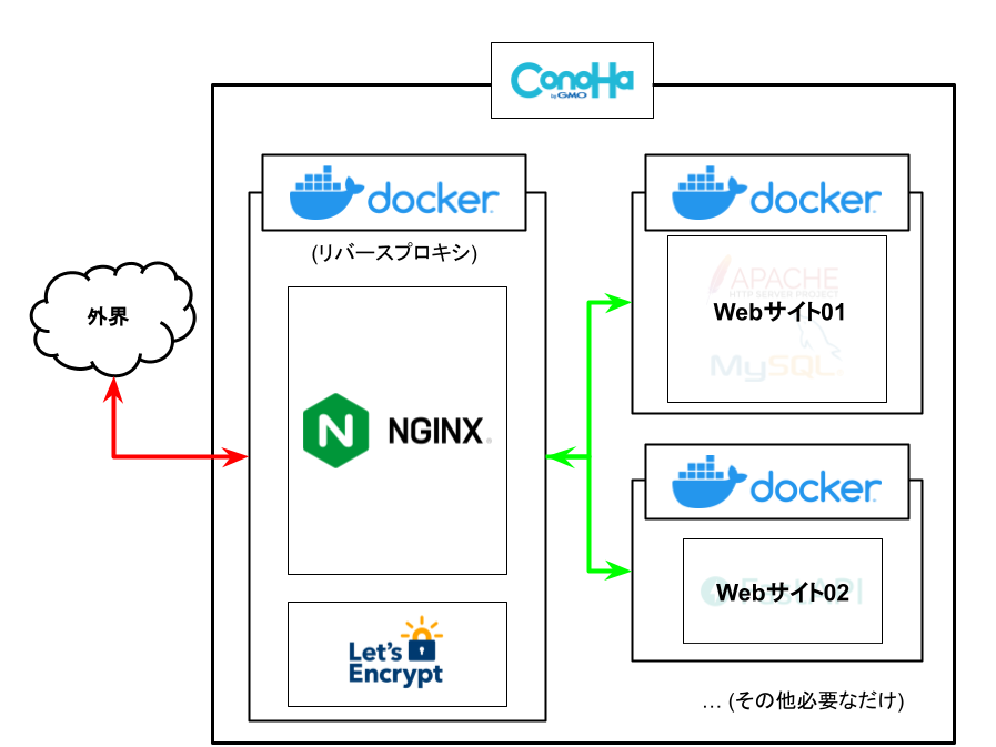 今回はこの構成をVPS(ConoHa)上のDockerで構築していきます。ちなみに、ConoHa上でのDocker構築は以前記事にしましたので、まだ構築していない方は参考にしていただけると幸いです (ConoHaのDockerイメージを使ってもらっていいと思います)。