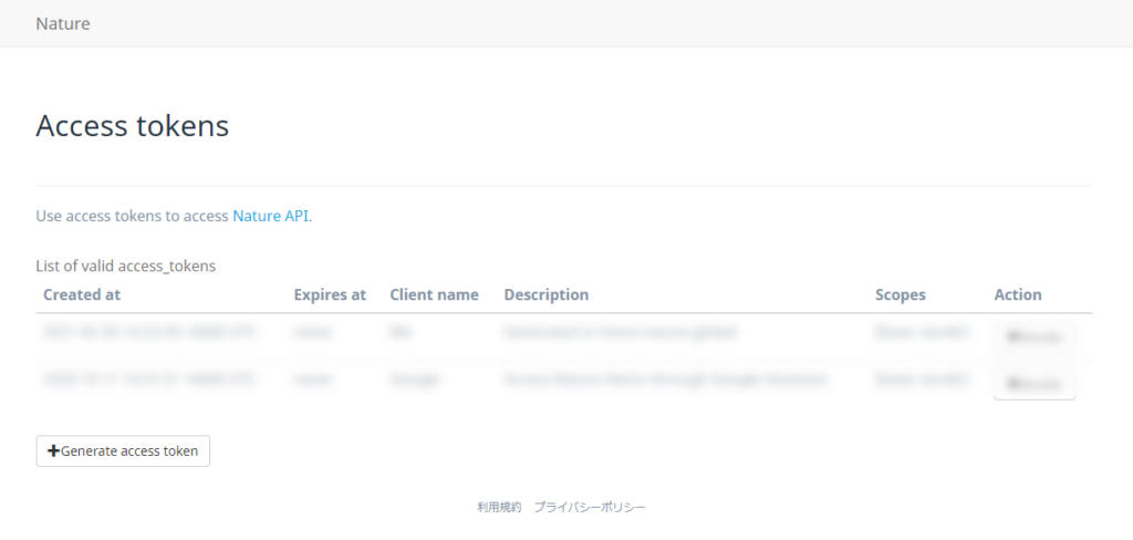 APIを使用するためのアクセストークンを取得していきます。というわけでまずは home.nature.global にアクセスしてアクセストークンを作成します。