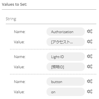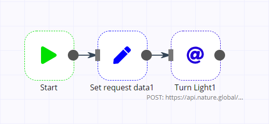 ワークフローの完成イメージは上記の通りです。ただ動かすだけであればSTART含め2つのノードだけで作ることもできますが、一応将来性を考えトークンや照明IDの設定はSETノードに切り分けています。
