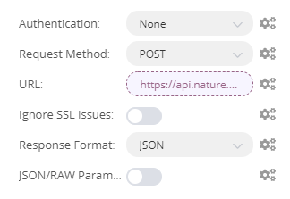 次がメインのHTTPリクエストノードです。このノードでは基本的にcurlで叩いた値とSETノードで登録した値を登録してあげれば大丈夫です。SETノードで登録した値を使うには各入力欄の右側にある歯車マークから「Add Expression」を選択して「Nodes」からSet→Values→String から選択することができます。あとはcurlで試した通りにHeaderとParametersに登録してあげるだけです。
